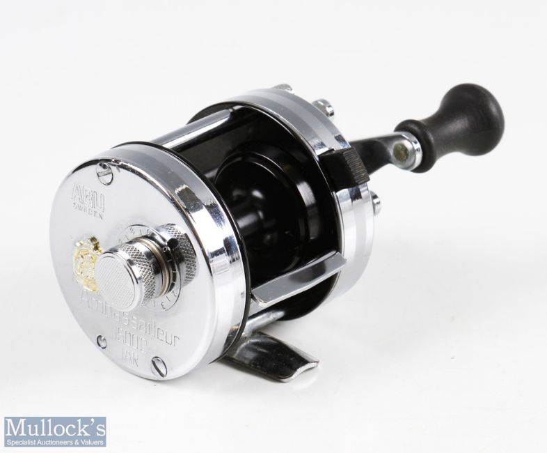 ABU Ambassadeur 1500C IAR multiplier reel in chrome finish c1997 numbered to foot 070007 with black line arbour, twin black handles, stamped makers marks to end plate, runs smooth, light signs of use