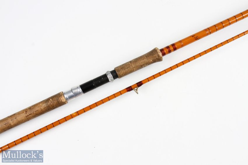 Olivers of Knebworth 10ft 3" 2pc Tench fishing rod with 28" double handle, slight signs of delamination apparent, agate butt ring, soiling to handle