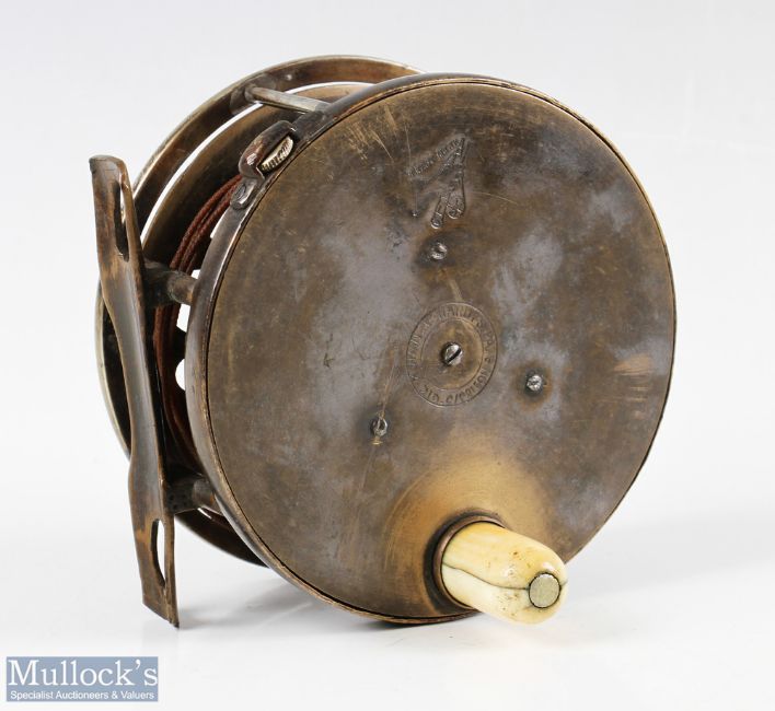Rare Hardy Bros Perfect 4 ¼" all brass transitional reel with nickel silver pillars and frame, larger ventilated face, rod in hand trademark, retaining some bronzed finish, waisted foot, strapped rim tensioner