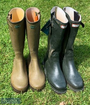2 x pairs of Wellington Boots to include Le Chameau size 11.5 UK (46) these have had the press-stud straps at the top of boots cut off, with a pair of Royal Hunter- UK 12 (47) with signs of wear- some discolouring to them (2)
