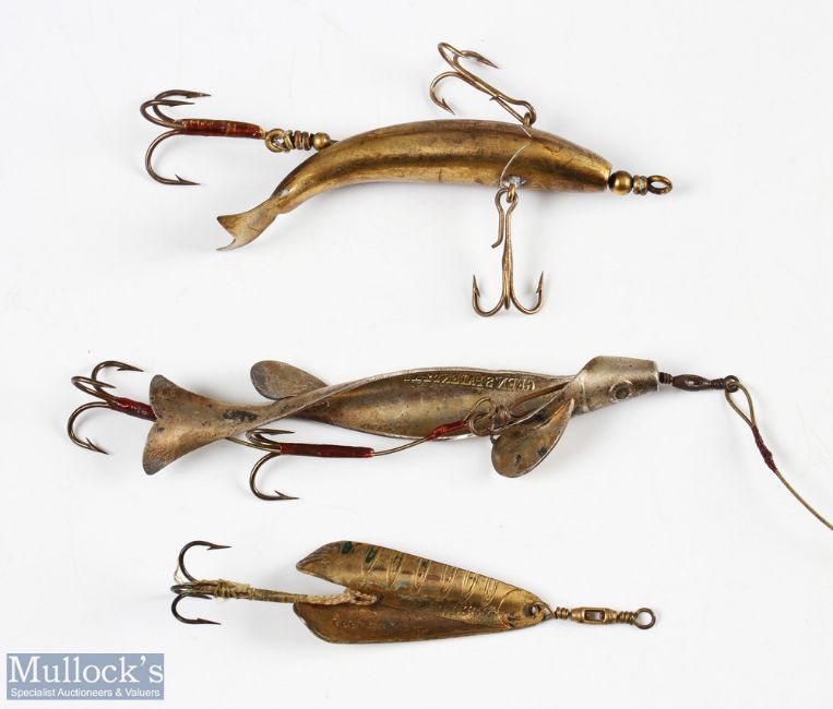 Geens Spiral Minnow brass 4" bait with curved hollow body, side marked  "Geens Patent 2103", original fins, stamped eye, with another Geens Patent Allcock's 2" bait and an Allock's hollow bodies Titbit 3 ¼" bait (3)