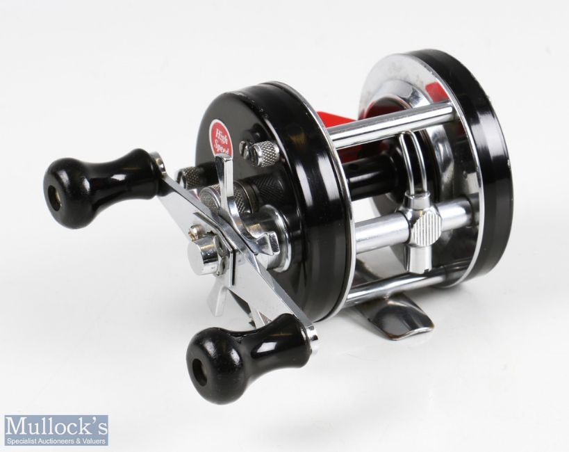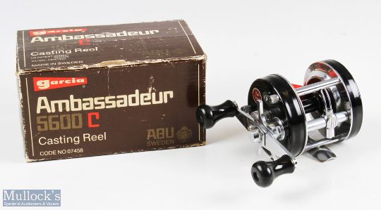 ABU Ambassadeur 5600C multiplier reel in black numbered to foot 720200, black line arbour, twin black handles, red thumb brake, runs smooth with signs of use, with makers box