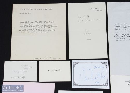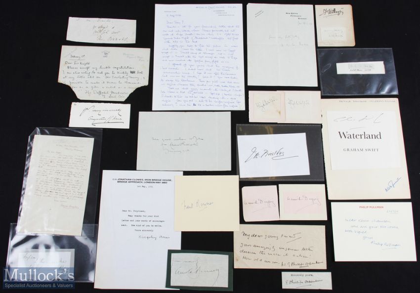LITERATURE AUTOGRAPH Selection - group of signed items by authors and other literary figures (mostly cut signatures or ends of letters signed) including: Thomas Pennant, Saul Cain, A E W Mason, Arthur Ransome, Philip Pullman, Hugh Walpole, J B Priestley, Warwick Deeping, E Phillips Oppenheimer, Frank O'Connor, Thomas Wright, Graham Swift, Eden Philpotts, Augustus Hare, Arnold Bennett, Charles Kingsley, Kingsley Amis, Edmund Blunden, Aldous Huxley, Raymond Chandler, Jerome K Jerome, Charles Greville, Laurie Lee, Joseph Heller, Edward Marsh, Laurence Housman, Gilbert Frankau, Stan Barstow, John Masefield, W H Davies, E V Lucas, Colin Dexter, J P Donleavy, Umberto Eco, Frederick Forsyth, Hall Caine, Nicholas Monsarrat, Iain Banks, Bernard Cornwell, Ken Follett, Jeffrey Archer