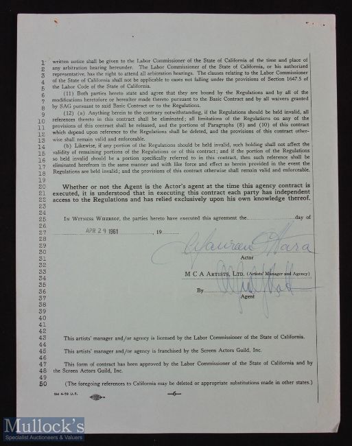 HOLLYWOOD - MUREEN O'HARA original agency contract signed by O'Hara, dated April 29th 1961. A printed document with typed and ms insertions, being an agreement between O'Hara and the MCA Artists Agency, whereby she agrees to pay them 10% of her earnings for the period of the contract which ran until 1964. During this period she made The Deadly Companions, The Parent Trap and The Wings of Eagles.