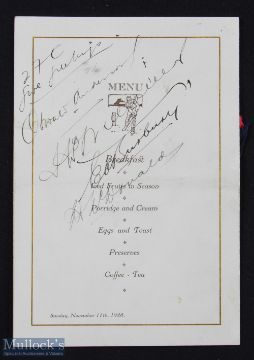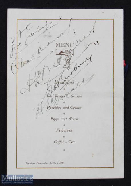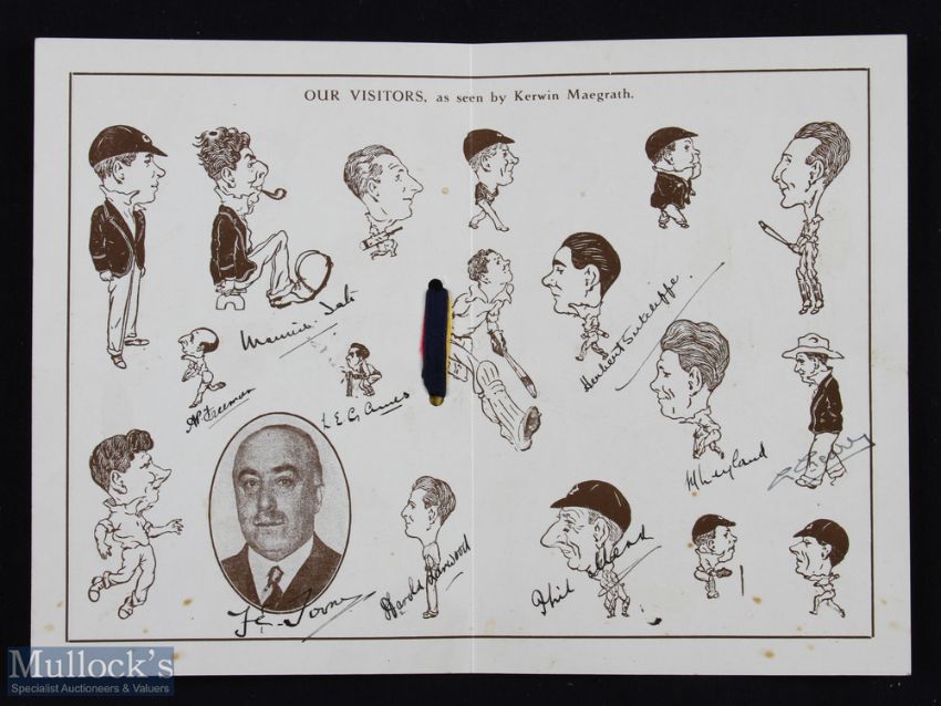 SPORT - CRICKET - the souvenir programme for the First World's Broadcast by the English Cricket Team from the studios of the New South Wales Broadcasting Corporation, Sydney, Australia on November 11th 1928, signed by members of the team including: Harold Larwood, Maurice Tate, A P Freeman, Les Ames, Herbert Sutcliffe, Maurice Leyland, George Geary, Phil Mead, and the Manager F C Toone. The souvenir features caricature portraits of the crickets, printed on buff coloured card. There is slight spotting but generally good condition. Rare