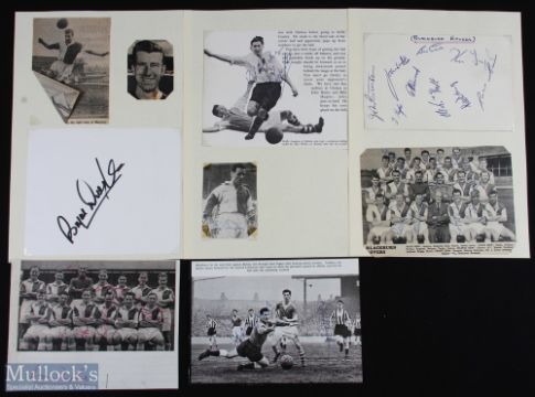 SPORT - FOOTBALL - BLACKBURN ROVERS fine album with a wealth of 200+ signatures of members of various Blackburn Rovers teams including album leaves bearing the signature of the 1933-34, the 1938-40 and the 1949-50 squads; individual signatures , some on album leaves and some laid down, signatures on newspaper articles/ photographs etc, the Bryan Douglas Testimonial Match programme from 1969, the brochure for the Thanksgiving Service for Ronnie Clayton in 2010, a set of nine John Player cigarette cards featuring Blackburn teams in seasons, 1883/84/85/86, 1890 and 1891, and 1928, together with two cards featuring the old and new FA cup, and a commemorative card issued by Dutton's Blackburn Brewery to celebrate Rovers' 1928 FA Cup victory, featuring a bw image of the Cup with the Blackburn ribbons on the lid. Together with three other items bearing the signatures of footballers including George Armitage (Wimbledon FC), Fred Callaghan and Jimmy Torrance (both Fulham), and the commentator Eddie Waring