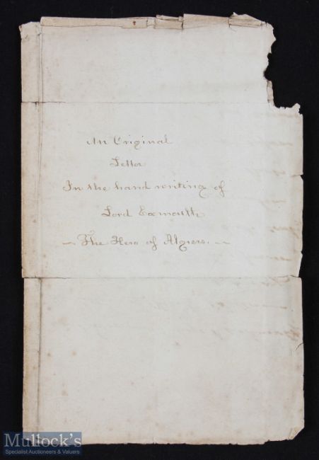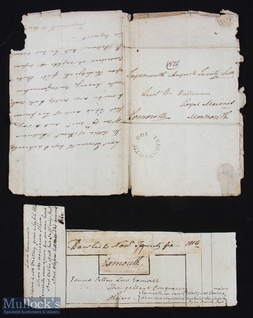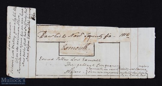 NAVAL - NELSON ERA - EDWARD PELLOW, VISCOUNT EXMOUTH - 'THE HERO OF ALGIERS' autograph letter signed in the third person dated August 26th 1826 with integral address panel issued as a free front signed by Exmouth to base. Telling his correspondent that he cannot supply the information his correspondent has requested. Together with a further signature attached to the remains of an album leaf.