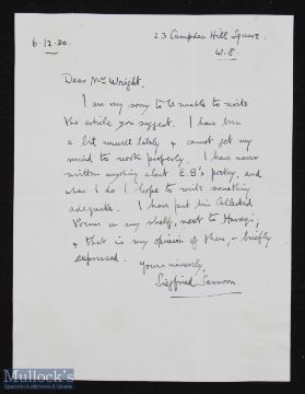 SASSOON (SIEGFRIED) poet. Fine autograph letter signed, dated June 12th 1930, 1p sm4to. To Mr Wright: 'I am very sorry to be unable to write the article you suggest. I have been a bit unwell lately & cannot get my mind to work properly. I have never written anything about E[dmund]B[lunden's] poetry and when I do I hope to write something adequate. I have put his Collected Poems on my shelf, next to Hardy's & that is my opinion of them - briefly expressed…'