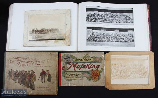BOER WAR - SOUVENIR OF THE SIEGE OF MAFEKING from original photographs by D Taylor, photographer, Mafeking 1899-1900 First Edition. Hard covers a little worn at corners, but interior contents appear fine. Approx 410x285mm, featuring 114 photographic views taken from the original Taylor photographs, including a panorama of the town looking west. A rare volume in remarkably good condition. Together with: The Leaguer of Ladysmith by Captain C M Dixon, first edition, hard covers soiled but interior contents appear fine. A collection of satirical cartoons drawn by Dixon at the height of the war, mainly intended to boost morale amongst the British troops. Rare. Together with: Siege Views Mafeking from original photos by E J Ross, taken during the siege. First edition - card covers, lacking bottom cover, but interior contents appear good. Another production of photographs taken during the siege. Together with two original photographs, the first showing a Boer patrol, 220x150mm, a little faded but legible, and the second showing a group of Boer soldiers, 220x150mm a little faded but clearly legible. A rare group of books and original photographs of the Boer War (3)