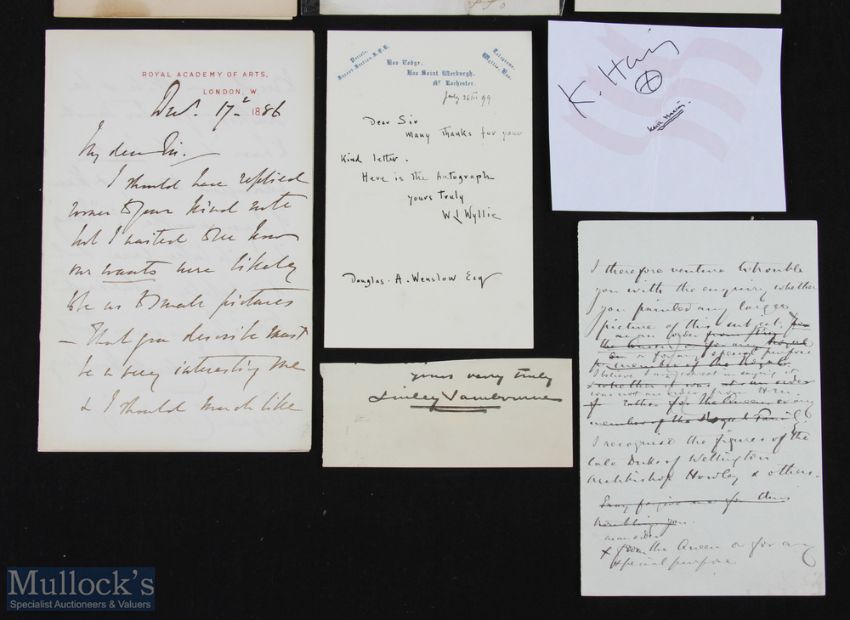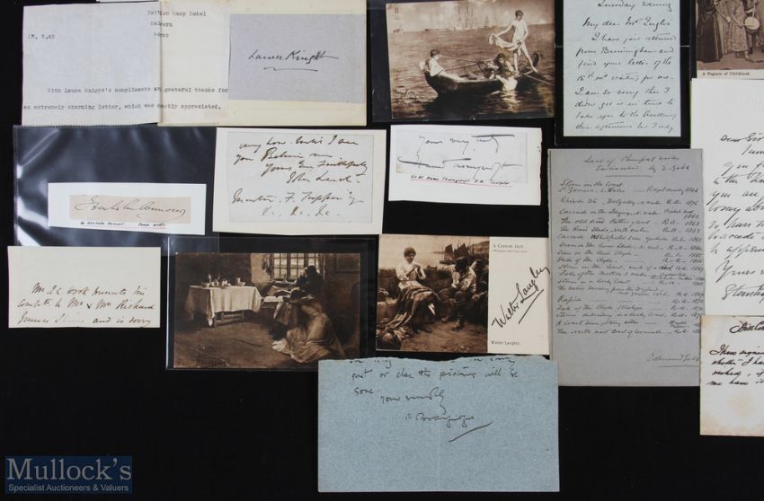 ART fine group of autograph letters and other autographic pieces by artists including: Cecil Aldin, Edward Gill, Hamo Thorneycroft, Stanhope Forbes, Frank Brangwyn, Frederick Hall, John Nash, Edwin Hayes, Laura Knight, Henry Scott Tuke, Frank Bramley, Charles Napier Hemy, Walter Langley, Ernest Waterlow, Albert Chevallier Tayler, James Charles Hooke, John Leech, Harry Friswell, Josiah Gilbert, John Gilbert, John Horsley, William Wyllie, Edward Sambourne, Michael Noakes, Keith Harring etc. Approx 33 separate pieces in all