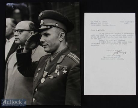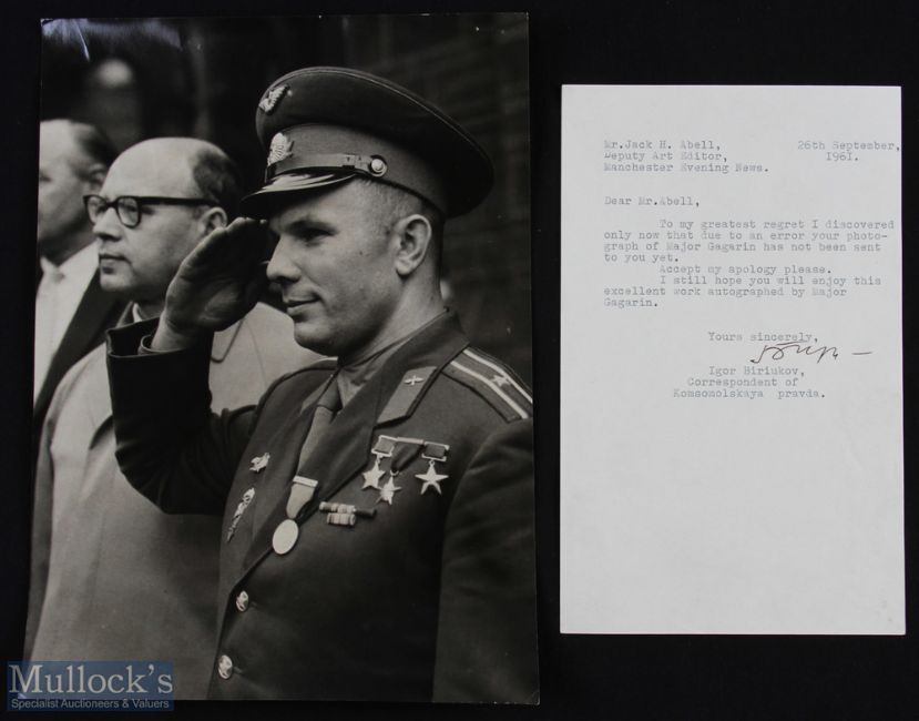 RUSSIA - COSMONAUGHT - YURI GARGARIN AUTOGRAPHED PHOTOGRAPH signed to the reverse in ink, the photograph measures 18.5x25cm approx., together with a signed typed letter by 'Igor Biriukov, Correspondent of Komsomolskaya pravda', in response to a request for a photograph by the Manchester Evening News in 1961. (2)