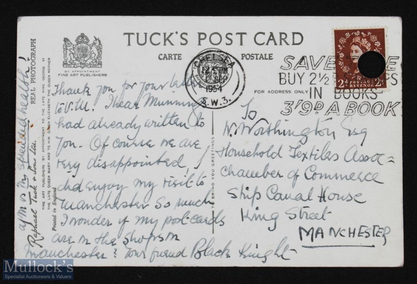 ART - SIR ALFRED MUNNINGS - artist famed for his equestrian paintings - amusing als in the guise of his Pekinese dog 'Black Knight' on a postcard: '…I hear Munnings had already written to you. Of course we are very disappointed I did enjoy my visit to Manchester so much. I wonder if my postcards are in the shops in Manchester…'