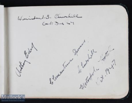 CHURCHILL (WINSTON) full signature in ink on an album page dated October 31st 1947 along with the signatures of Anthony Eden and Clementine Churchill with the date 'Metropole Hotel October 1947, in an autograph book containing other signatures including Charlie Chester and a signed self portrait cartoon by George Robey. With letter of provenance concerning the Churchill signature