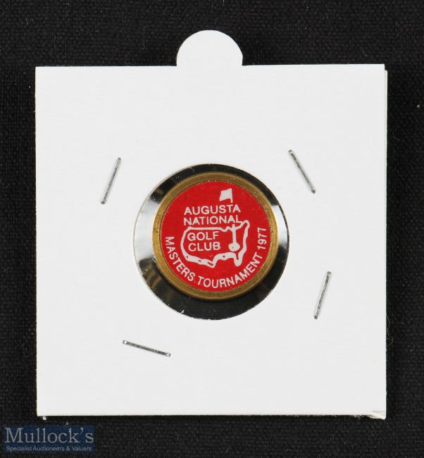 Original 1977 US Masters Golf Tournament Ball Marker - (won by Tom Watson for the 1st time) brass holder c/w brass stem, red and white centre featuring the Masters logo - overall 18mm dia x 4mm stud style stem. (VG). Note 1975 was the first year official ball markers were introduced