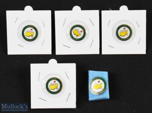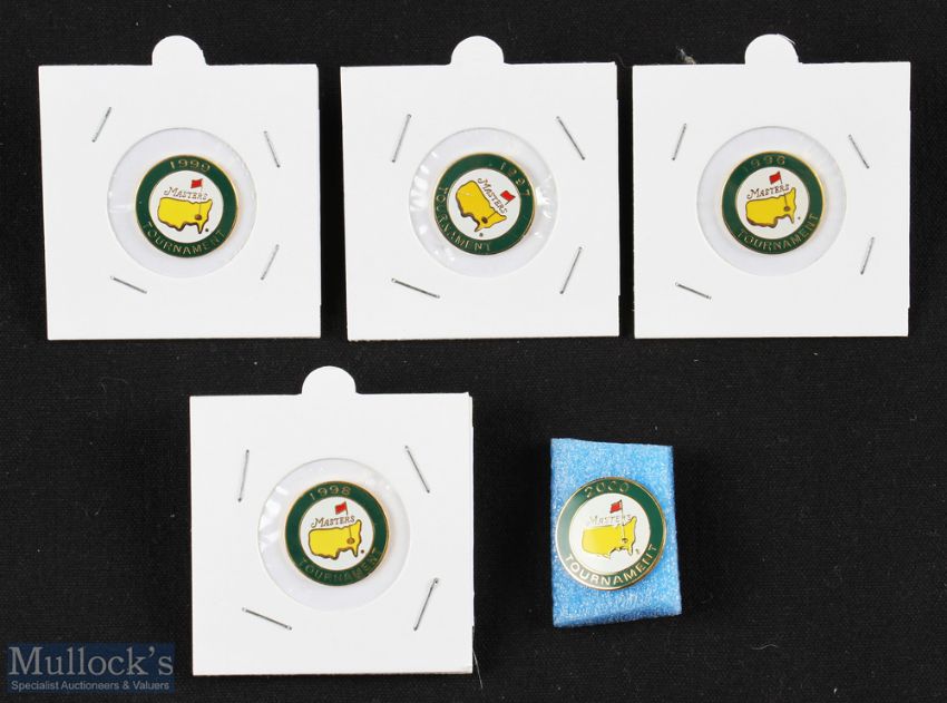5x Original 1990s US Masters Golf Tournament Enamel Ball Markers - 1996 (Nick Faldo 3rd success), 1997 (Tiger Woods), 1998 (Mark O'Meara), 1999 (José Maria Olazabal 2nd success) and 2000 (VJ Singh) - straight stem type featuring the Masters logo - overall 18mm dia x 4mm (VG).