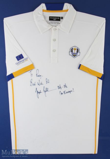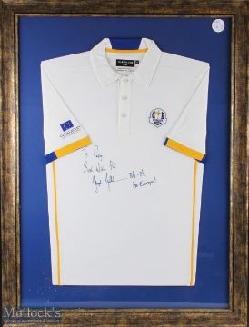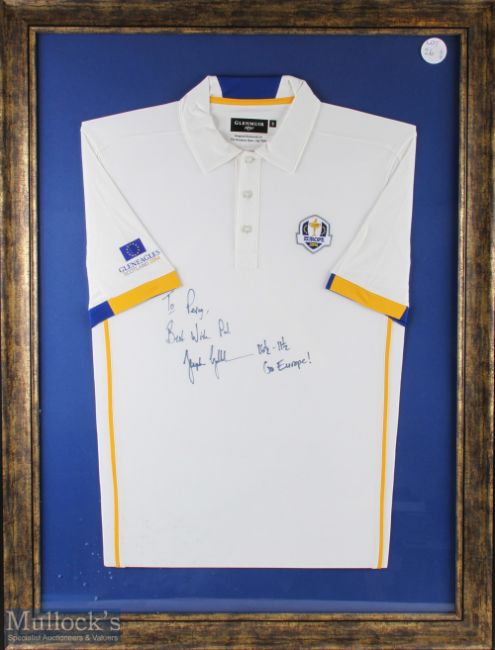 2014 European Ryder Cup players shirt, signed Stephen Gallacher - with a dedication to shirt, framed and mounted under glass- size #73cm x 98cm