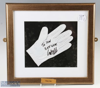 Signed Golf Glove Garry Orr Scottish golfer a white glove used, with dedication to Ian framed and mounted size 41cm x 38cm