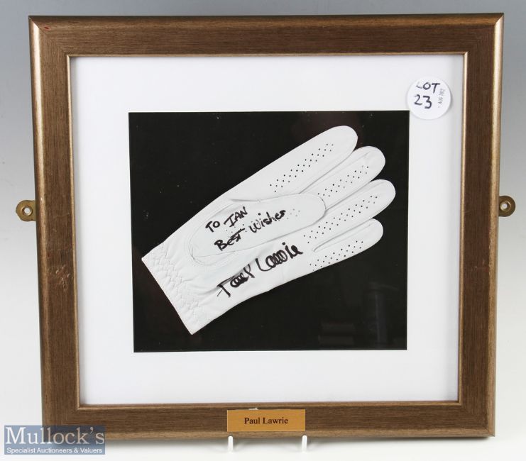 Signed Golf Glove Paul Lawrie Scottish golfer, a white glove used, with dedication to Ian framed and mounted size 41cm x 38cm