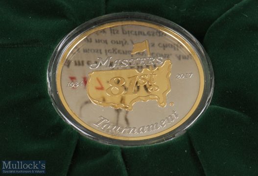2017 Masters Golf Tournament Commemorative silver and gilt medal - winner Sergio Garcia ltd ed no 217/800 stamped to the rim '999 - fine silver' - the obverse embossed with 81st Tournament and logo and on the reverse embossed with 'Amen Corner' - in the original green case c/w detailed leaflet and Masters white sleeve
