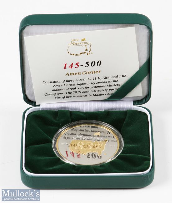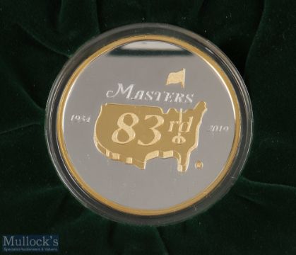 2019 Masters Golf Tournament Commemorative silver and gilt medal - winner ltd ed no 145/500 stamped to the rim '999 - fine silver' - the obverse embossed with 83rd Tournament and logo and on the reverse embossed with 'The Amen Corner' - in the original green case c/w detailed leaflet and Masters white sleeve.