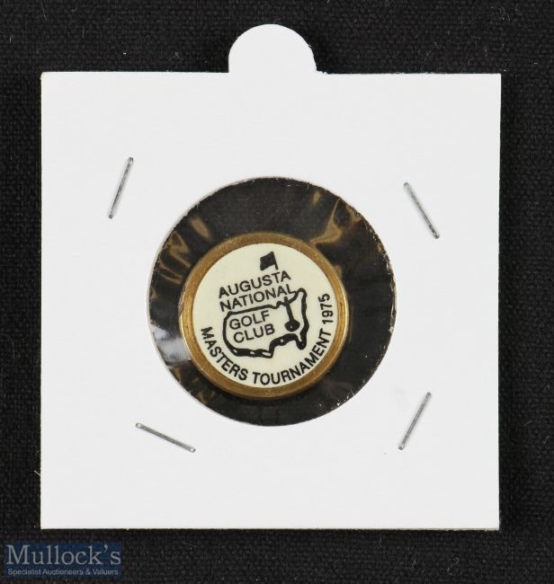 Original 1975 US Masters Golf Tournament Ball Marker - (won Jack Nicklaus for the 4th Time) brass holder c/w brass stem, white/cream centre featuring the Masters logo - overall 18mm dia x 4mm stud style stem. (VG). Note 1975 was the first year official ball markers were introduced