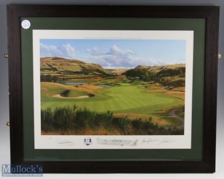 2014 Official Ryder Cup print of the 2nd hole PGA centenary course, Gleneagles No 157 of an edition of 1250, signed by Paul McGinley, Stephen Gallacher. Framed and mounted under glass - size #71cm x 88cm