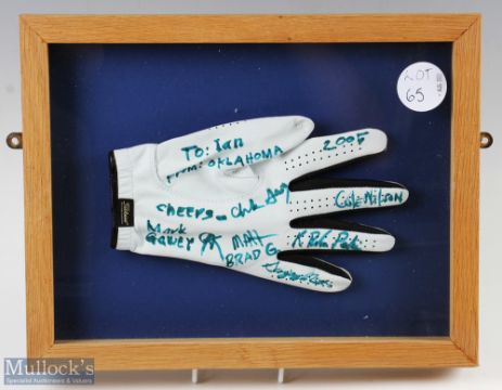 Signed Golf Glove 2005 from Oklahoma open, with indistinct signature multi signed by player/officials framed and mounted under glass #27cm x 34cm