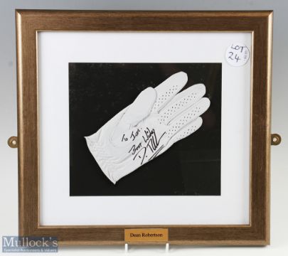 Signed Golf Glove Dean Robinson Scottish golfer, a white glove used, with dedication to Ian framed and mounted size 41cm x 38cm