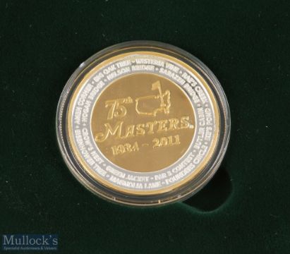 2011 Masters 75th Golf Tournament Commemorative silver and gilt medal - winner — Charl Schwartzel - ltd ed no 109/350 stamped to the rim '999 - fine silver' - the obverse embossed with tournament dates, logo and names of each hole and on the reverse embossed 'The Clubhouse' - in the original green case c/w detailed leaflet and Masters white sleeve