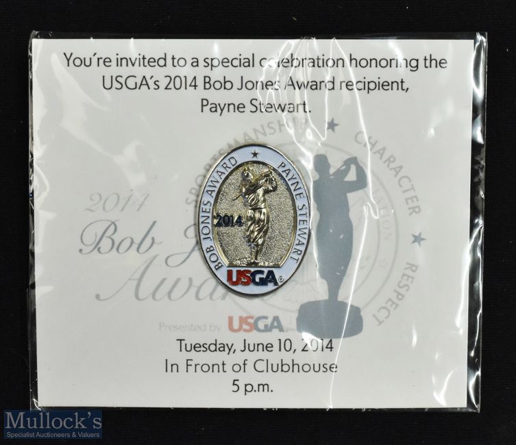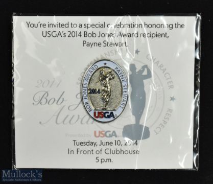2014 USGA "Bob Jones Player Award" invitation enamel lapel pin badge - recipient Payne Stewart held on Tuesday, June 10, 2014 in Front of Clubhouse 5pm - still on the original unopened card - on the original card