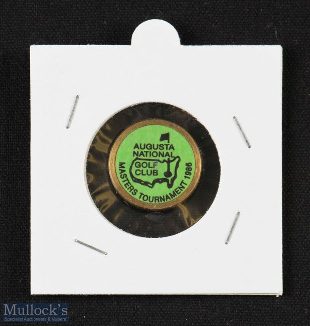 Original 1986 US Masters Golf Tournament Ball Marker - (won by Jack Nicklaus for the 5th time 20 years after his last success) brass holder c/w brass stem, green centre featuring the Masters logo - overall 18mm dia x 4mm stud style stem. (VG). Note 1975 was the first year official ball markers were introduced