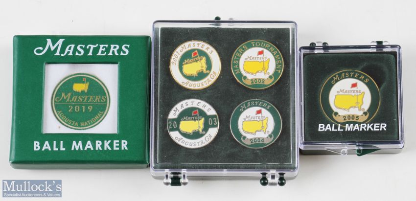 6x original US Masters Golf Tournament Enamel Ball Markers including 4x won by Tiger Woods - 2001 (Tiger Woods), 2002 (Tiger Woods) 2003 (Mike Weir), 2004 (Phil Mickelson), together with 2005 (Tiger Woods) and 2019 (Tiger Woods) both flat ball markers, various designs and sizes all acquired at the tournament