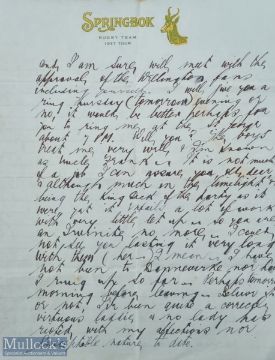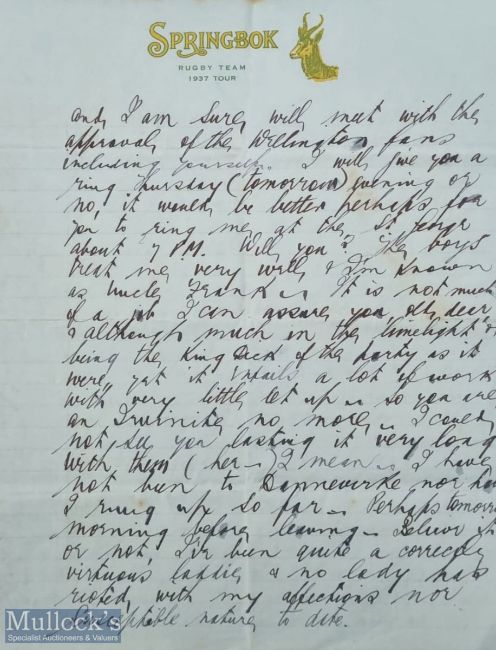 Very rare 1937 S African Tour to NZ, F Glasgow letter: Frank Glasgow (1905 All Black) was the NZ liaison man with the 1937 Boks. In this muti-page letter on lovely official Springbok headed paper he writes to 'Ollie': "the Boks are a fine lot of fellows...they play a game which is exceedingly attractive to the public." Also.. this team has a number on the injured list, especially in the forwards ....they are fielding a fairly weak team today…" It was written on the morning of the game v Manawatu and is signed Frank on the side of the last page. Fascinating & 'open' and VG