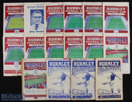 Burnley home match programme selection to include 1947/48 Preston NE, 1949/50 Huddersfield Town (poor), 1951/52 Hartlepools Utd (ph), 1952/53 Sunderland (FAC), 1953/54 Cardiff City, 1954/55 Aston Villa, Sheffield Wednesday, 1955/56 Sunderland, Everton, Vienna (friendly) (poor), 1956/57 Luton Town, Preston NE, 1957/58 Preston NE, Swansea town (FAC), 1958/59 International XI (Dougall testimonial), Leeds Utd, Aston Villa (FAC), 1959/60 Leicester City, 1960/61 Sheffield Wednesday (FAC), Brighton & HA (FAC), Everton, Hamburg (European Cup), 1961/62 QPR (FAC), Tottenham Hotspur (FAC final), 1962/63 Ex. Burnley XI v Showbiz XI (at Accrington Stanley), Burnley v Colin McDonald XI (testimonial), Birmingham City (19 January 1963) 1963/64 Chelsea, Huddersfield Town (FAC), 1965/66 Bournemouth (FAC),1966/67 VFB Stuttgart (friendly), Eintracht Frankfurt (friendly), 1967/68 Arsenal (FLC), 1968/69 Leicester City (FLC), Crystal Palace (FLC), 1969/70 Ipswich Town, Liverpool, Wolves (FAC), 1970/71 Tottenham Hotspur, 1973/74 Arsenal, 1975/76 Liverpool (FLC), 1978/79 Blackburn Rovers; fair condition. (42)