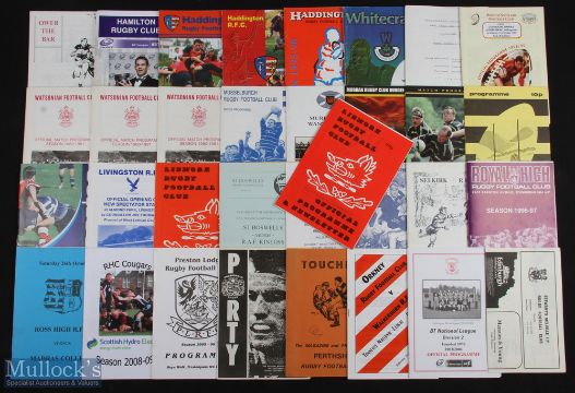 Scottish Club Rugby Programmes, H-W (65+): Fine wide selection, 1970s to 2000s, first class and well below, to inc Hawick v Heriots 01/1973, Heriots v Cardiff 02/1981, Jordanhill v Edin Wands 10/1975, Stewart-Melville's v Hawick 10/1979 & v Heriots 03/1983 & Watsonians v Hawick 02/1981. VG