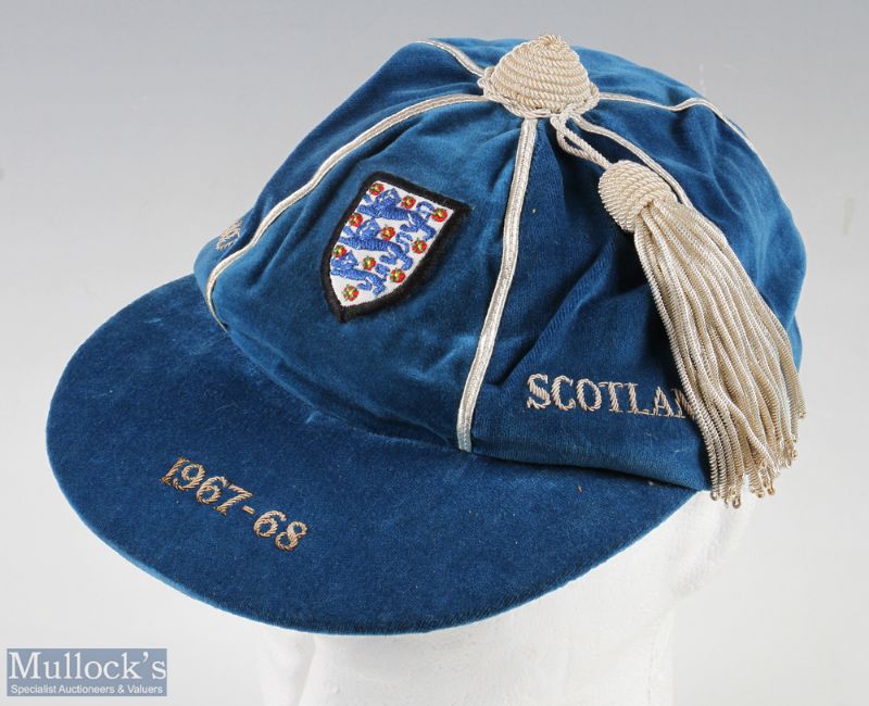 1967-68 Ray Wilson England International Football Cap - England won this to qualify for the European Champions with Silvered thread embroidered Ireland (Northern Ireland) and Scotland, comes in a card box with Ray Wilson's signature + notes on this match and the results/comments of the later European championship, "we felt we missed a golden opportunity to add the Euro to the World Cup" Ray Wilson was capped 63 times for England, playing for Huddersfield, Town, Everton, Oldham Athletic and Bradford City. Comes with COA from the Old Boy's Network Corporate Golf Days signed by Ray Wilson stating it was his cap
