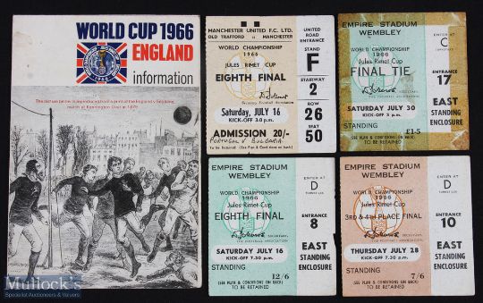 Tickets: 1966 World Cup England v Mexico (Wembley) 16 July 1966, Portugal v Bulgaria 16 July 1966 (Manchester Utd), Portugal v USSR (Wembley) 28 July 1966 (3rd/4th place); England v West Germany World Cup final 30 July 1966 at Wembley (Sellotape stain to all 4 sides) plus World Cup information leaflet (sales, travel, accommodation etc.) fold out type; o/all fair condition. (5)