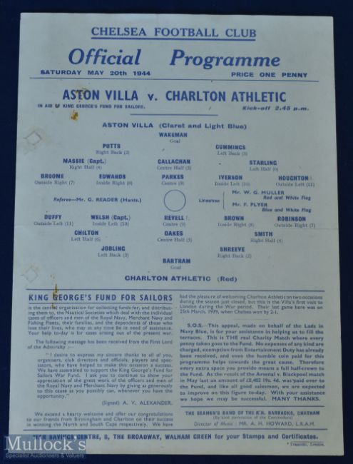 1944 Cup Winners Challenge Aston Villa v Charlton Athletic single sheet match programme at Chelsea 20 May 1944 (fund raiser for King George's Fund for Sailors); punch hole expertly repaired, o/all good condition. (1)