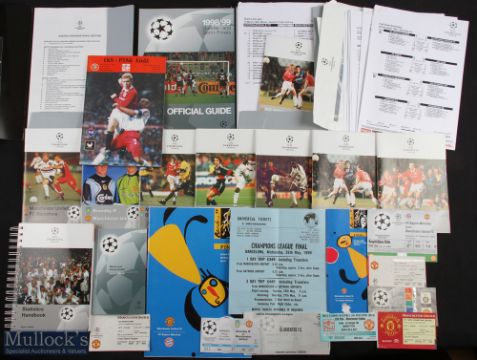 Manchester United treble season 1998/1999 Champions League guides, stats, programmes, tickets to include statistics hand book, media/venue guide, guides for group phase quarter and semi-finals; programmes v Barcelona (h), LKS Ptak (a), Brondby (a) & (h), Bayern Munich (h), Inter Milan (h) + (a), Juventus (h), also team sheets + final game summaries, plus tickets homes LKS Ptak, Barcelona, Juventus; aways Juventus, Inter Milan, Brondby, Bayern Munich (September 1998), LKS Ptak; Champions league final programme v Bayern Munich at Barcelona + stadium leaflet and marketing leaflet regarding flights. (A Lot)