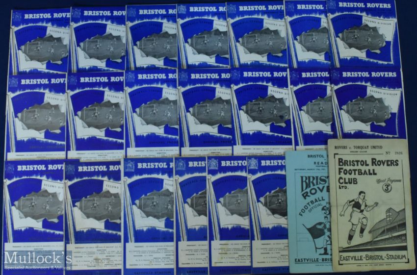 Collection of Bristol Rovers home match programmes to include 1948/49 Torquay Utd, 1950/51 Reading, 1953/54 Doncaster Rovers, 1954/55 Luton Town, Portsmouth (FAC) (damaged), Chelsea (FAC) (damaged), 1955/56 Doncaster Rovers (FAC), 1956/57 Preston NE (FAC), Leyton Orient, 1957/58 Derby County, Burnley (FAC), Mansfield Town (FAC), 1958/59 Stoke City, Sheffield Wednesday, 1959/60 Leyton Orient, Scunthorpe Utd, 1960/61 Norwich City, Aston Villa (FAC), Sunderland, Luton Town, Swansea Town 1961/62 Plymouth Argyle, Oldham Athletic, Swansea Town, Derby County, 1962/63 Port Vale (FAC), 1963/64 Crewe Alexandra, Mansfield Town 1964/65 Weymouth (FAC), 1966/67 Arsenal (FAC), Grimsby Town, 1967/68 Mansfield Town, 1968/69 Peterborough Utd (FAC), Barnsley, 1969/70 Gillingham, 1970/71 Fulham, Brighton (FLC), 1971/72 Stoke City (FLC), Sunderland (FLC), 1972/73 York City, Brighton (FLC), 1974/75 Plymouth Argyle (FLC), 1975/76 Nottingham Forest, 1970s Bernard Hall testimonial brochure, 1977/78 Crystal Palace; fair/good condition. (40+)