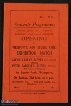 1953 Westport (R of I) new sports park opening with carnival + international football match Carey X1 v Everton; Carey international XI (with Ted Sagar (Everton), Johnny Carey (Man United), Con Martin (Aston Villa, Arthur Fitzsimmons (Middlesbrough), Wally Fielding (Everton), Paddy Fagan (Hull City) + others v Everton (including O'Neill, Farrell, Hickson, Eglington) 21 June 1953 match programme; good.
