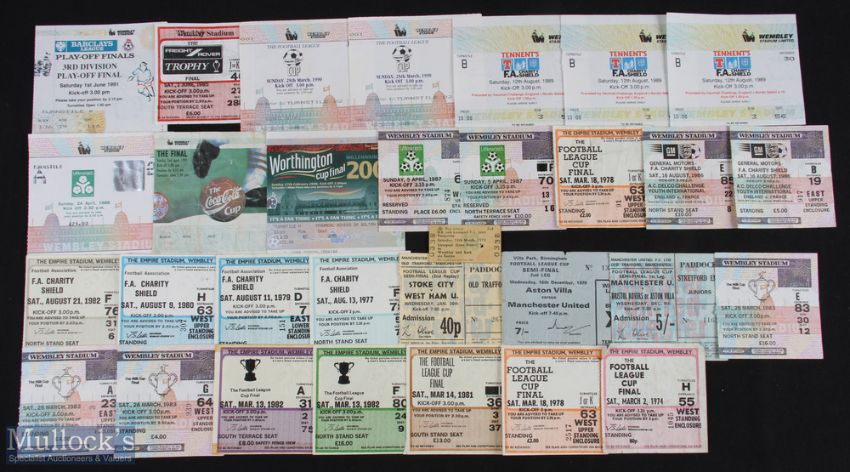 Tickets: Football League Cup finals 1974, 1978 x2 + 1978 train ticket Liverpool to Wembley (perforation), 1981, 1982 x2, 1983 x3, 1987 x2, 1988, 1995, 2000; Football League Cup s/f 1970 Manchester Utd v Aston Villa, Aston Villa v Manchester Utd, 1972 Stoke City v WHU (2nd replay) (creases); Charity Shield 1977, 1979, 1980, 1982, 1986 x2, 1989 x3; Zenith Data final 1990 x2, Freight Rover trophy 1985; 3rd Division playoff Final 1991; varied condition. (31)