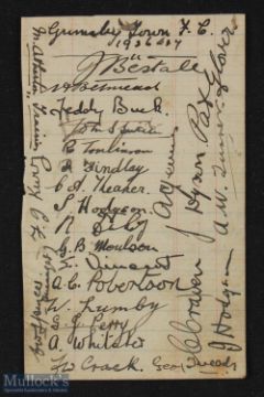 Autographs: 1936/1937 Grimsby Town signatures (in ink) to page Bestall, Betmead, Buck, Tomlinson, Findley, Theaker, Hodgson, Moulson, Vincent, Robertson, Lumby, Perry, Whitaker, Crack, Craven, Hodgson (J), Turner, Dyson, Glover, Spencer (manager), Kurz, Atherton, (trainer), plus others. (24)