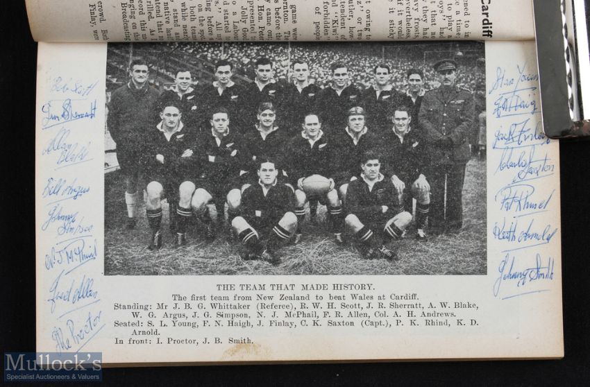 1947 signed Rugby Book 'Broadcasting with The Kiwis': Fine record of the popular Kiwis' tour of 1945 by the legendary broadcaster Winston McCarthy, who was in uniform and accompanied these players from the NZ Expeditionary Force just after WW2. Signed by the squad to internal team photograph page. Lengthy introduction, full reports of all games plus v useful stats section and historical overview of the King's Cup at the end of WW1. Inevitable browning of 'wartime' paper but VG overall inc pictorial cover. Nice!