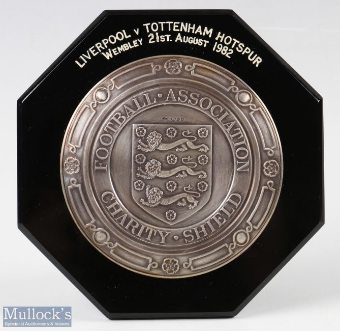 1982 FA Charity Shield Plaque Liverpool v Tottenham Hotspur 21st August 1982 hallmarked silver by Mappin & Webb on black Bakelite surround, width 13cm, in makers box together with match program and ticket