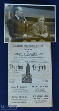 1952/53 Boston Utd v Grimsby Town Midland League match programme 9 April 1953 (Bill Shankly in the Grimsby team at No. 10), also b&w photo of Bill Shankly, in suit & tie, with a director (press stamp on back); fair condition. (2)