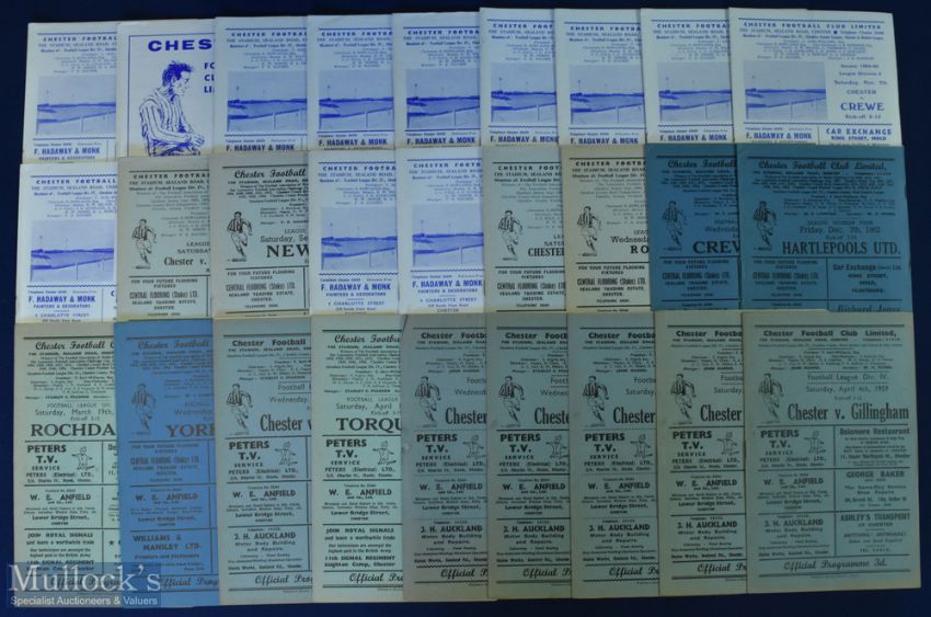 Collection of Chester home match programmes to include 1952/53 Oldham Athletic, 1956/57 Stockport County, Rochdale, 1957/58 Wrexham + supplement, Bradford City, Bury, Hull City + insert, Mansfield Town, Oldham Athletic, Scunthorpe Utd, Stockport County, 1958/59 Exeter City, Gillingham, Oldham Athletic, Port Vale, Shrewsbury Town, Watford, Crewe Alexandra, Darlington, 1959/60 Torquay Utd, Rochdale, 1962/63 York City, Crewe Alexandra, Hartlepools Utd, 1963/64 Stockport County, Rochdale, Halifax Town, 1964/65 Crewe Alexandra, Crewe Alexandra (FAC), Chesterfield, Oxford Utd, Bradford City, York City, Rochdale, Newport County, Millwall, Halifax Town,Doncaster, 1965/66 Doncaster Rovers, Chesterfield, Barnsley, Torquay Utd, Hartlepools Utd, Darlington, Crewe Alexandra, 1966/67 Exeter City, Notts. County, Chesterfield, Southend Utd, Rochdale, Crewe Alexandra, 1967/68 Chesterfield, Newport County, Port Vale, Southend Utd, Rochdale, Hartlepools Utd, Crewe Alexandra, 1968/69 Halifax Town, Rochdale, Chesterfield, Notts County, York City, Swansea City, Southend Utd, Doncaster Rovers, 1969/70 York City, Newport County, Chesterfield, Port Vale, 1973/74 Scunthorpe Utd, Hartlepools Utd, Bury, Darlington, 1974/75 Shrewsbury, 1975/76 Rotherham Utd, 1976/77 Gillingham, Shrewsbury Town, 1977/78 Walsall, Shrewsbury Town, 1978/79 Blackpool/Shrewsbury Town (double issue), Walsall, Bury 1979/80 Wimbledon, 1981/82 Walsall, Chesterfield, 1982/83 Aldershot, Wimbledon, Bury 1983/84 Bury, Rochdale, Hartlepools Utd; fair condition. (90+)
