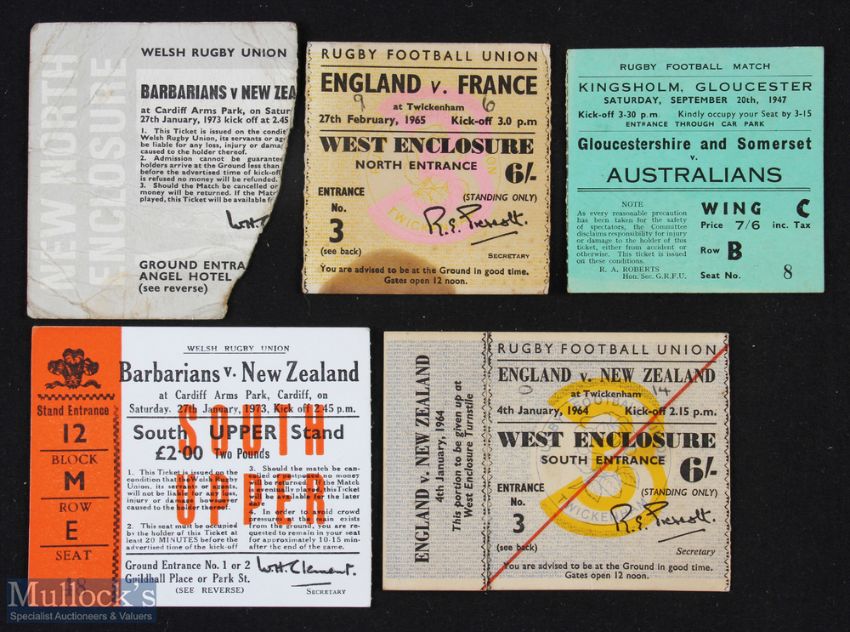Rugby Ticket selection inc scarce (5): To inc scarce Gloucestershire & Somerset v Australia at Gloucester, 1947; England v NZ 1964 and France 1965 (small stain, scores to both); & a poor enclosure & splendid stand example for the great Barbarians v NZ game at Cardiff, 1973. Worth a bid!