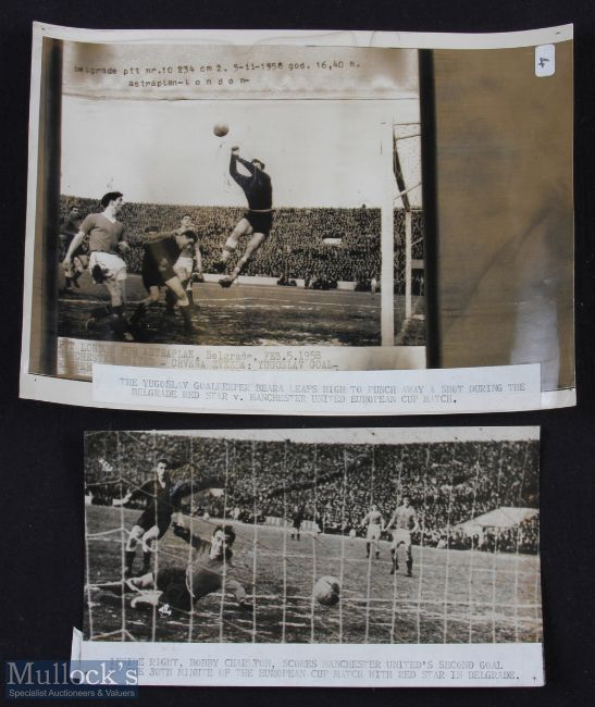 Photographs of the 1957/1958 Red Star Belgrade v Manchester United European Cup match 5 February 1958 to include b&w action photo of Bobby Charlton scoring United 2nd goal (photo shows goalkeeper & defender with the ball entering the net Bobby Charlton out of picture) press stamp to the reverse; also Beara the Red Star keeper punching the ball away with Dennis Viollet and Tommy Taylor in the picture (press stamp to the reverse); original. (2)