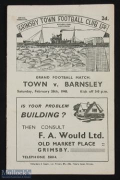 1947/48 Grimsby Town v Barnsley friendly match programme 28 February 1948 at Blundell Park; small edge tear, o/wise fair/good. (1)